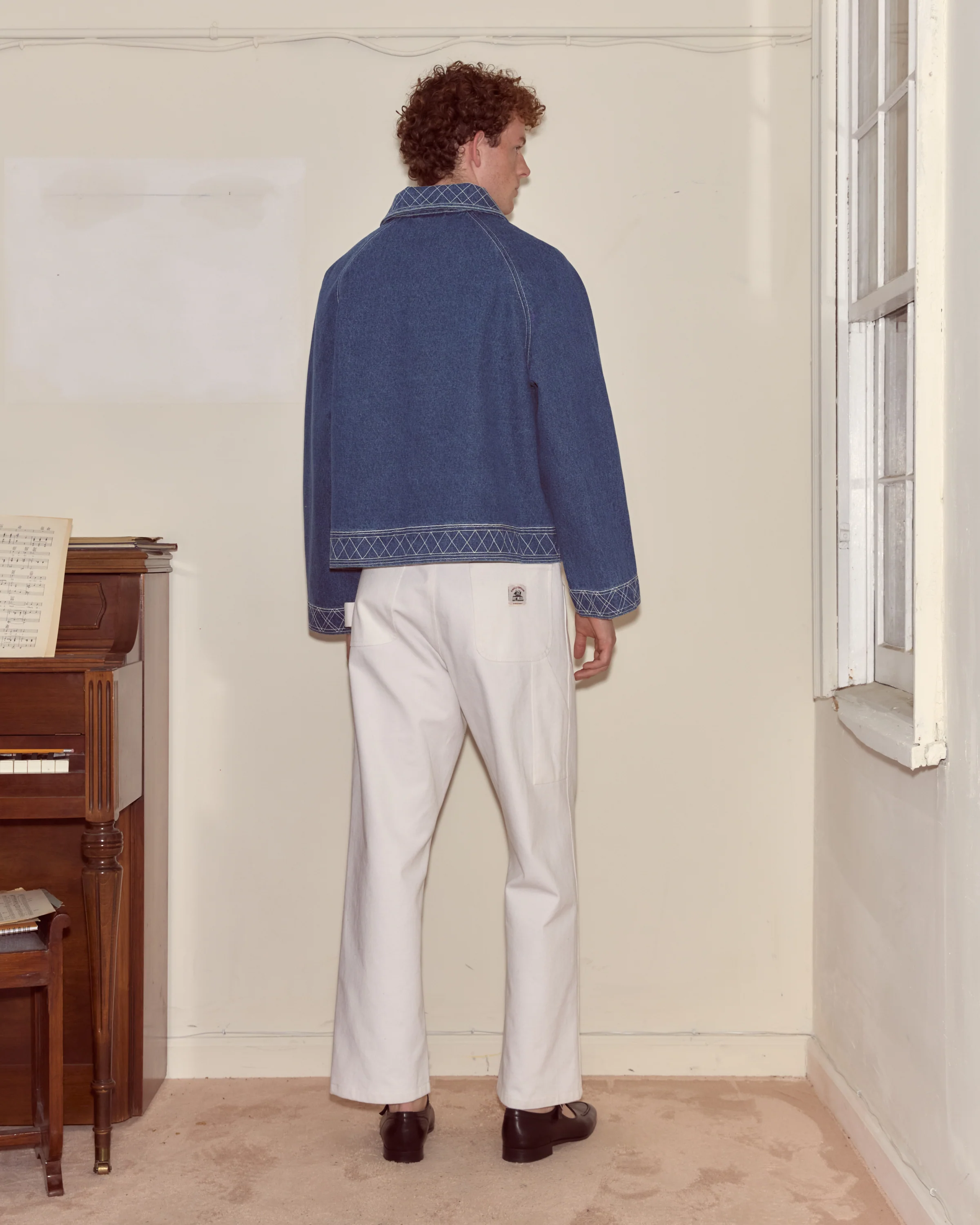 This jacket is based on a vintage denim smock of Emily's. The original smock was from the 1970s-1980s and was embroidered with a white geometric pattern and a red monogram. We reproduced the embroidery along the hem, collar, and sleeves of this jacket, which is cut in a workwear silhouette.