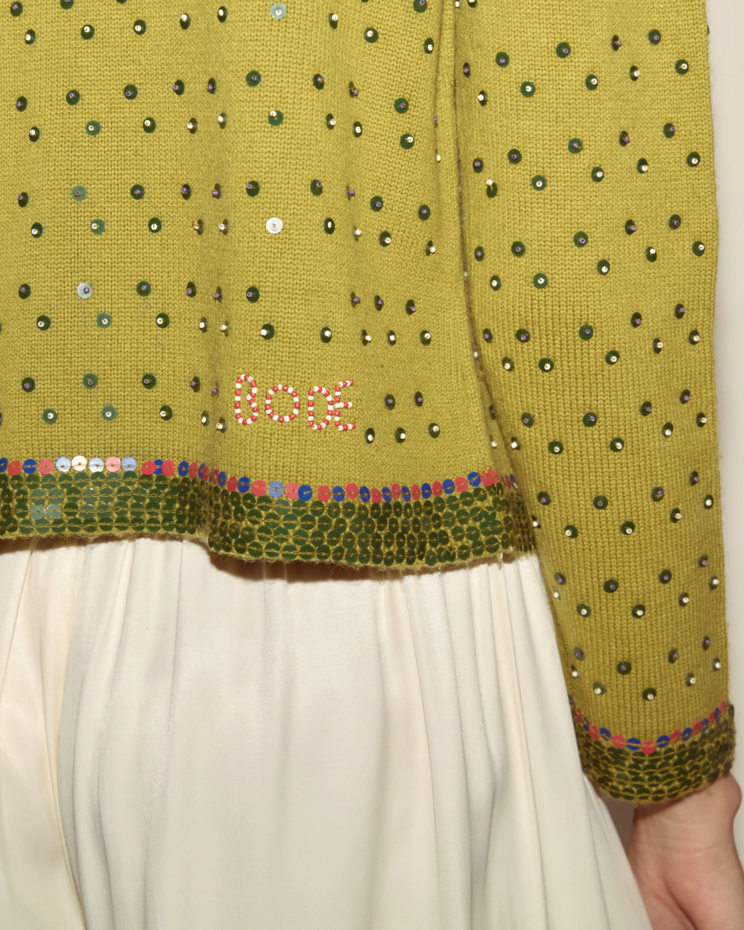 Evocative of J.M. Barrie's Peter Pan, this shimmering cardigan is studded with green sequins to catch the light. It features hand-beaded floral appliqués down the front placket.