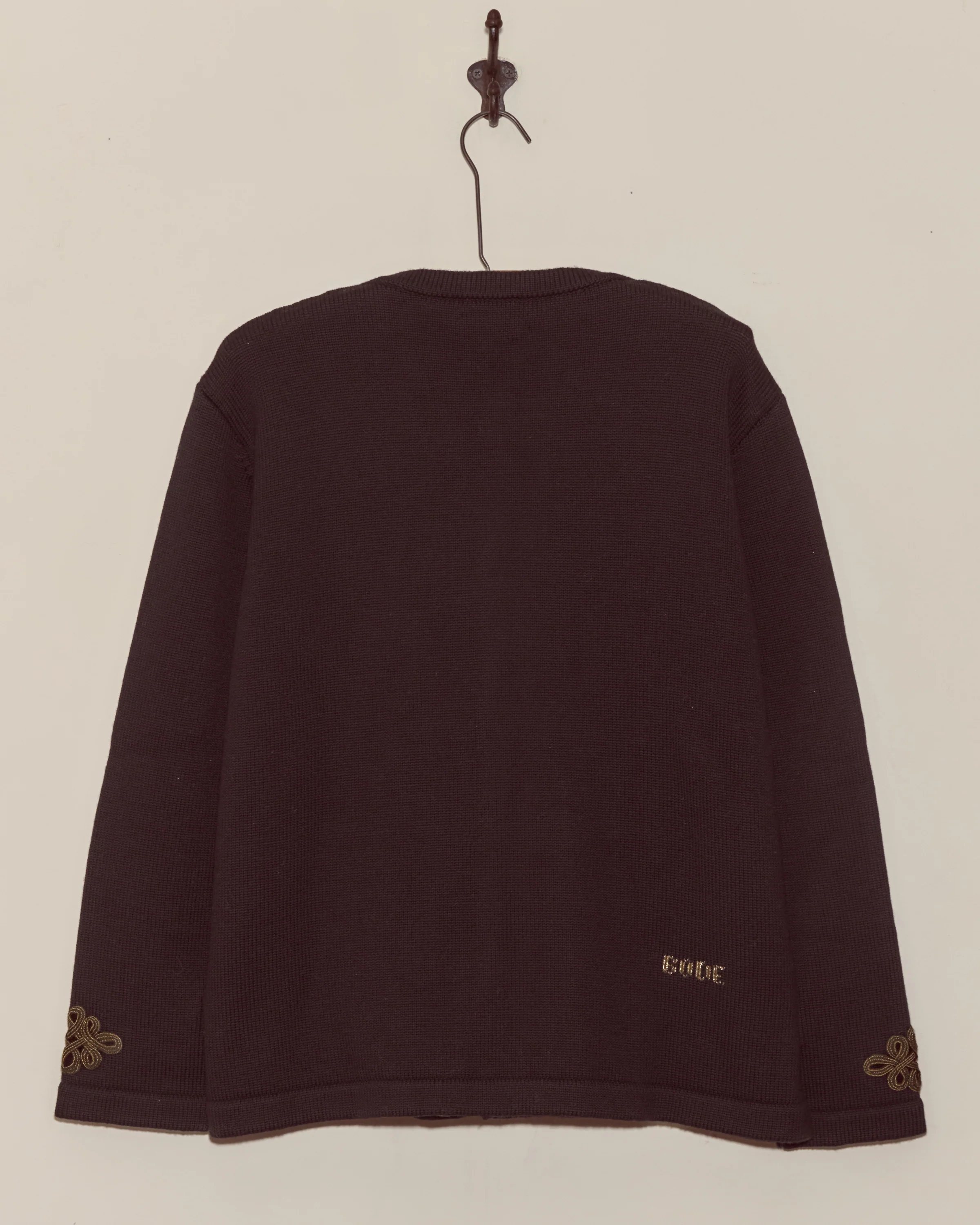 This cardigan is knit from soft merino wool. It features bronze trompe l'oeil frog closures down the front placket.
